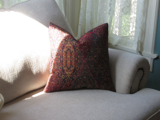Red, Gold, Blue Diamond Pillow Cover, Woven Jewel Tapestry Brocade