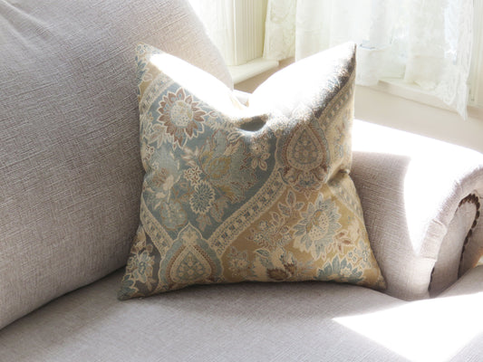 Gold and Blue Brocade Floral Pillow Cover