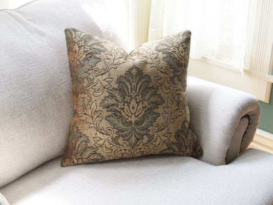 Gold and Green Medallion Pillow Cover, Chenille Damask Pattern