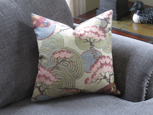 Tan, Green, Pink Asian Birds Pillow Cover, Kyomi in Document