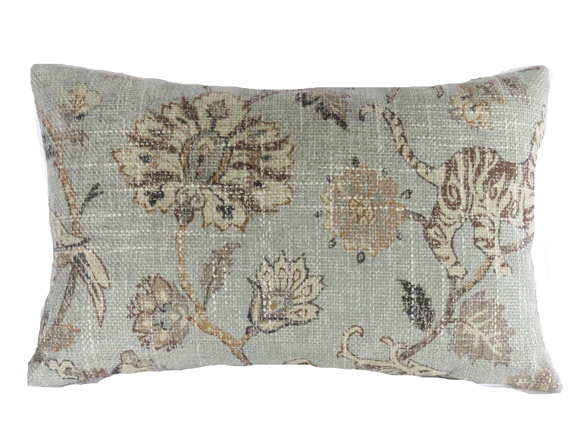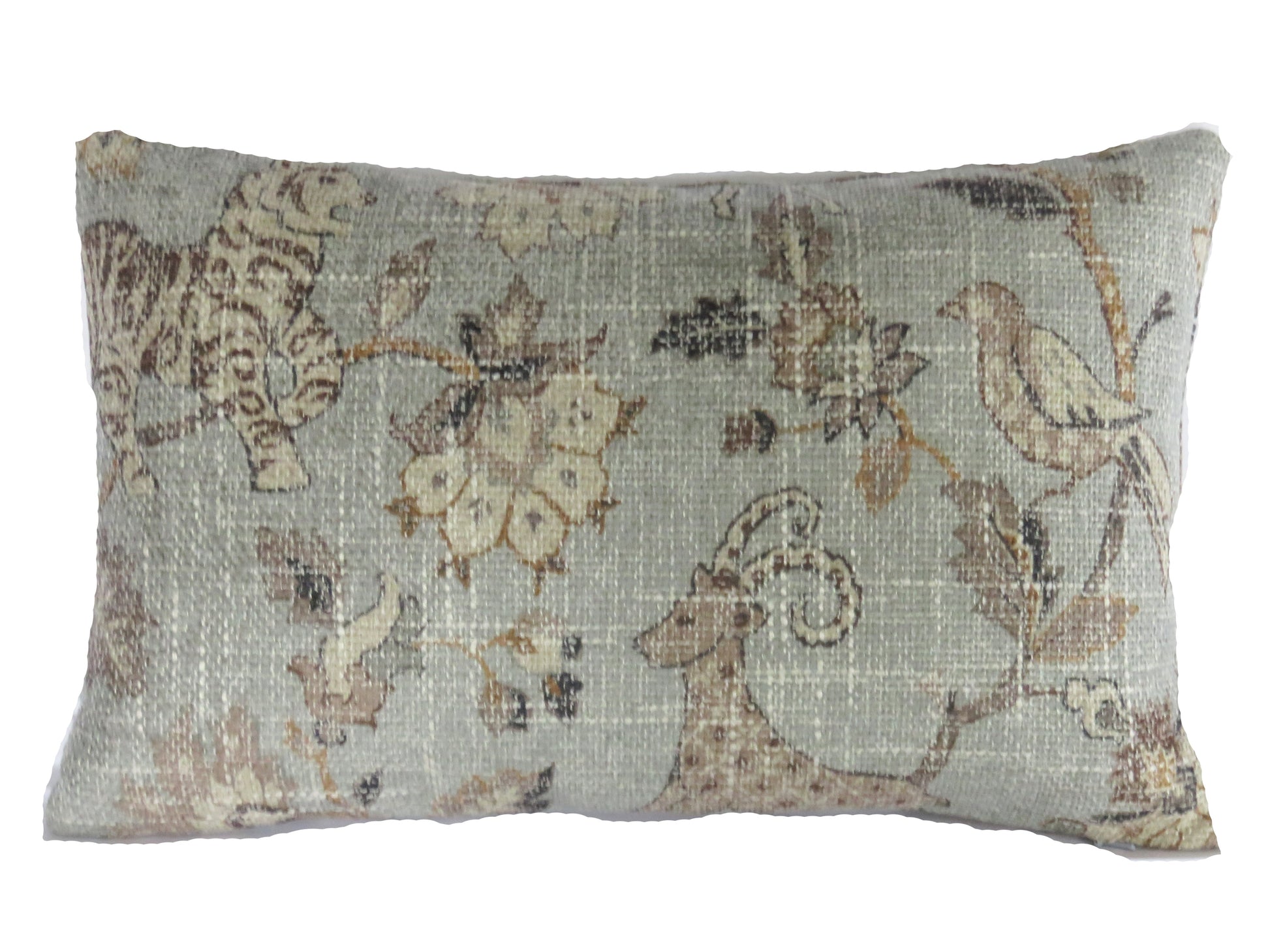 11 x 17" pillow cover, meant to be used with a 12x18"insert, not included, is a beautifully detailed, heavy upholstery fabric with a stylized animal and floral printed design. PK Lifestyles On Safari, in Moonstone , has a chunky weave and a distressed looking print. Animals include tigers, antelope, and birds in many shades of brown, black, and gold on a pale blue-grey background. Same fabric on the back, different part of the motif, invisible zipper closure in the bottom seam. Multiples of this pillow, if still available, feature different sections of this elegant fabric. Insert not included. Please use the zoom feature on the pictures to see the beautiful pattern and texture of this unique fabric.