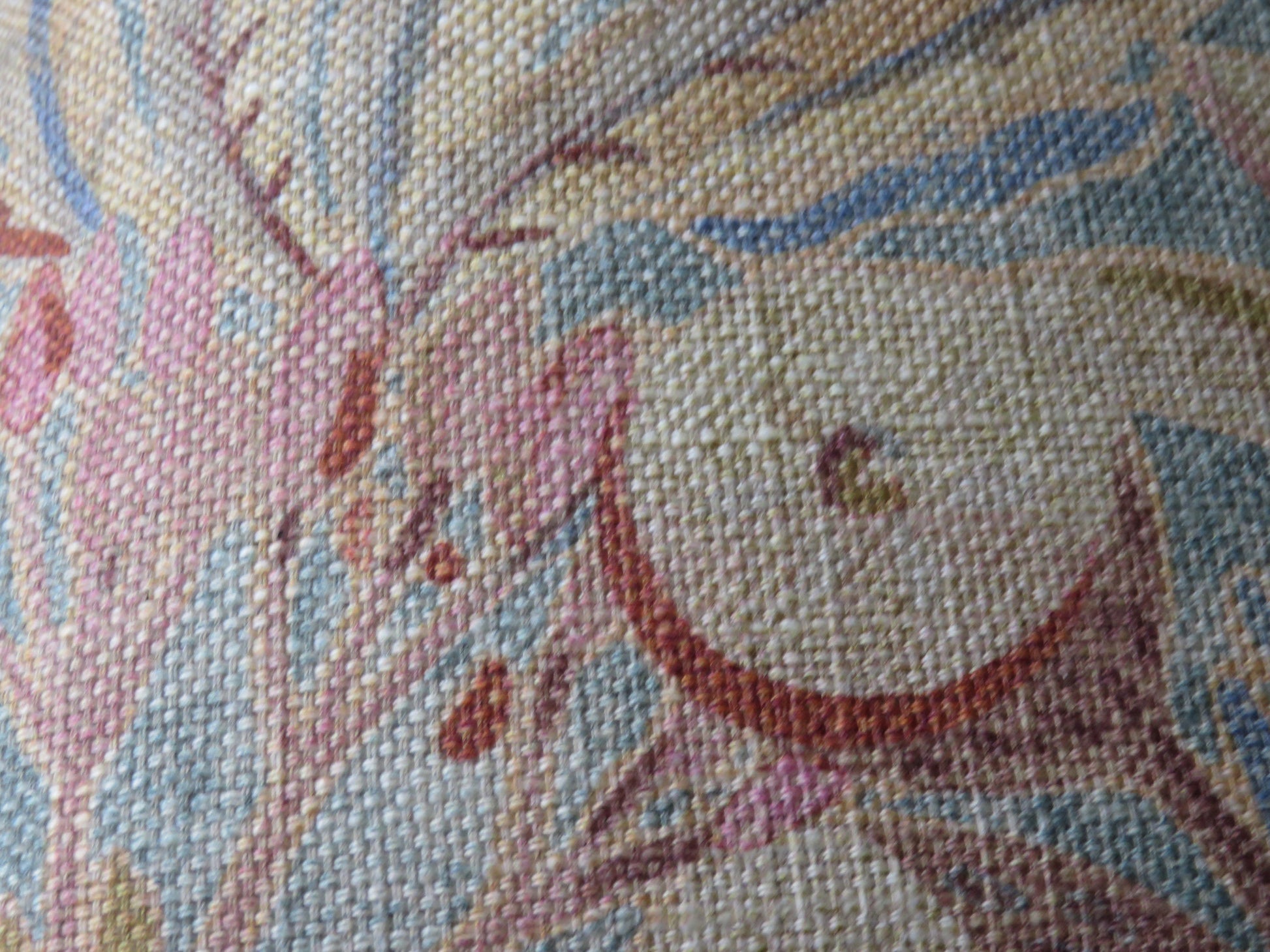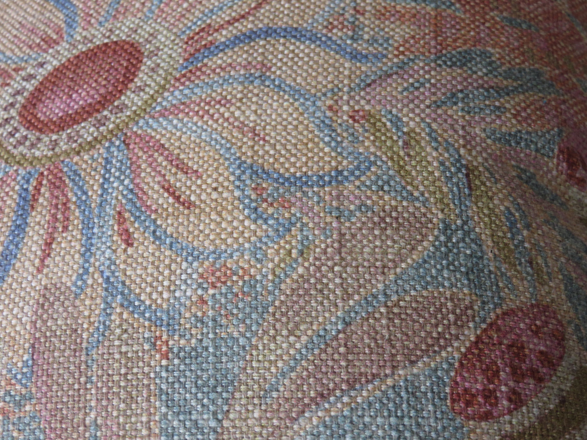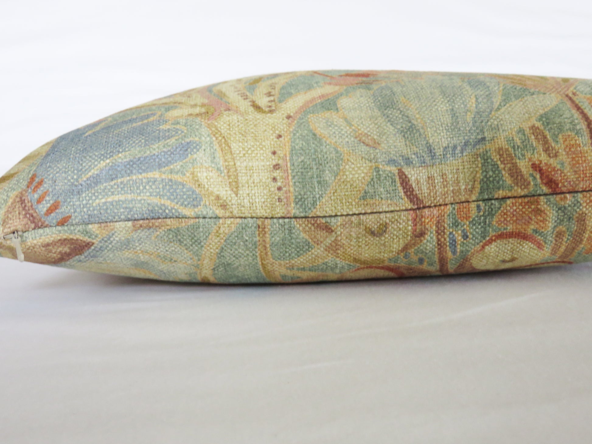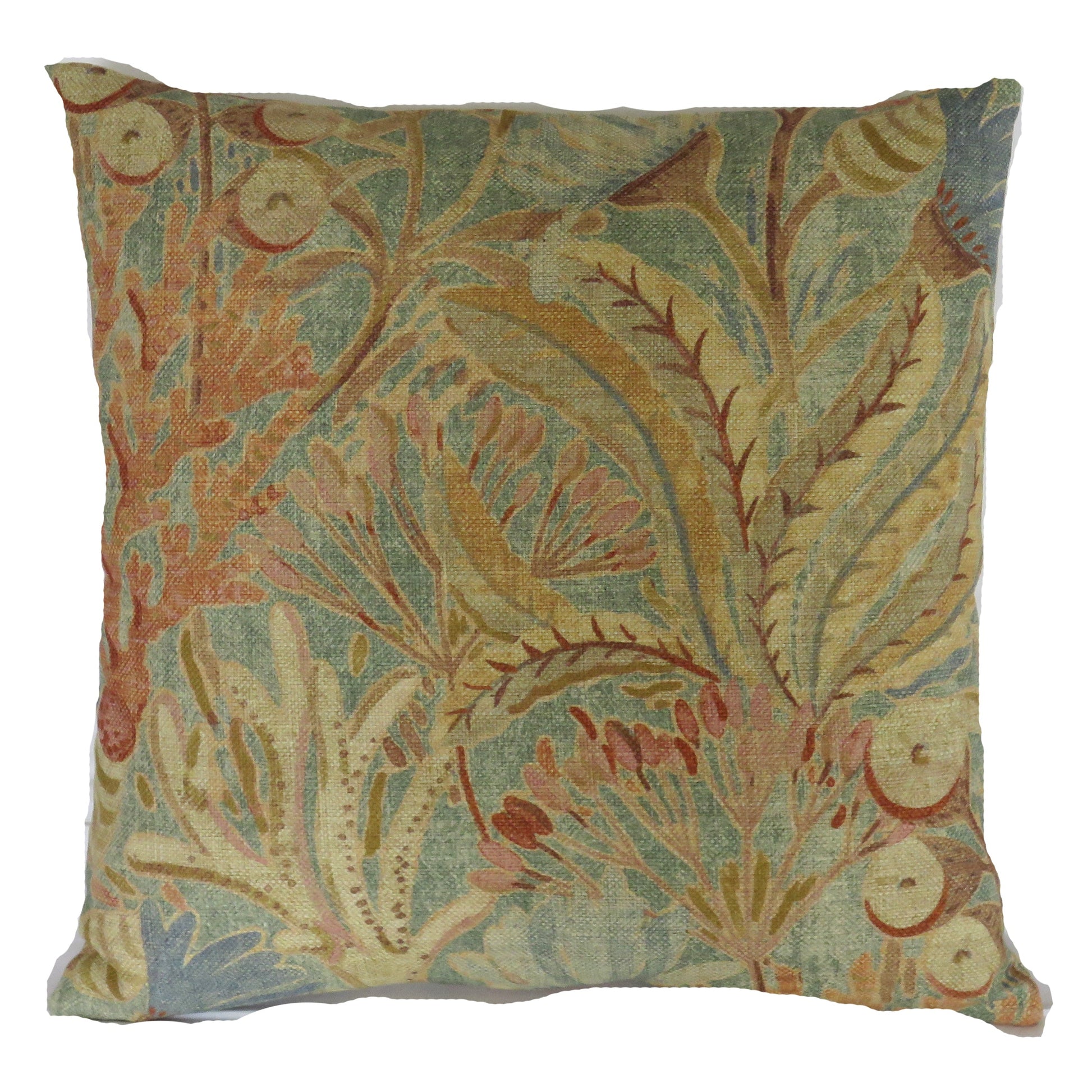 17 x 17" pillow cover is meant for use with an 18" insert (not included) and is created from a cotton / linen print upholstery fabric with a colorful fantasy floral, featuring various flowers, leaves, and some elements that look like sea coral. Shades of blue, orange, gold, and many others. P K Lifestyles Discoveries in Sandstone. Multiples of this pillow cover, if still available, feature different placement of this large floral. Back is the same fabric, different section of the pattern. Hidden zipper closure. Insert not included. Please use the zoom feature on the photos to see the beautiful detail on this unique fabric. Samples available upon request.