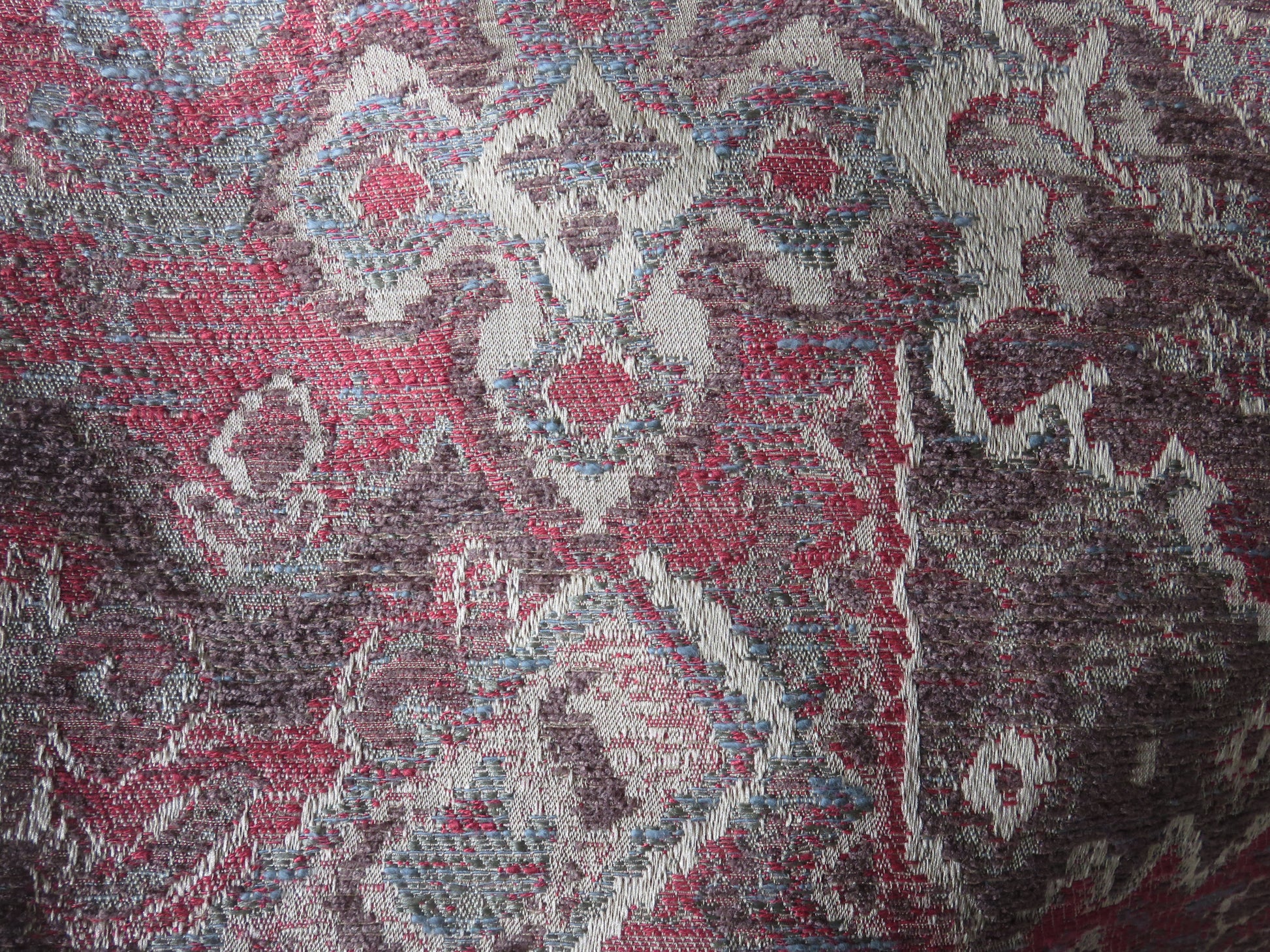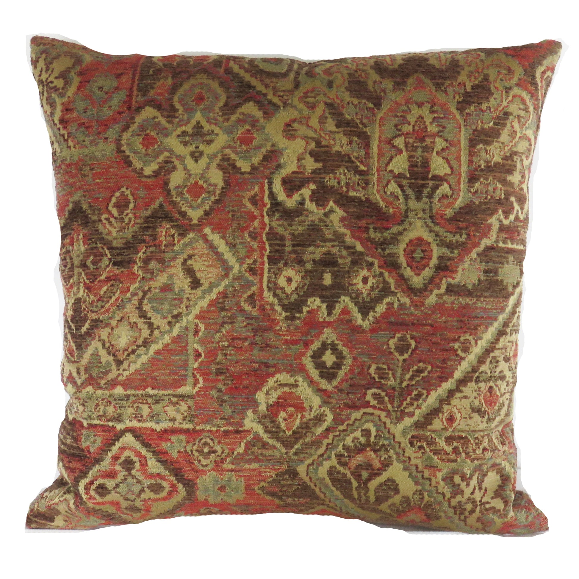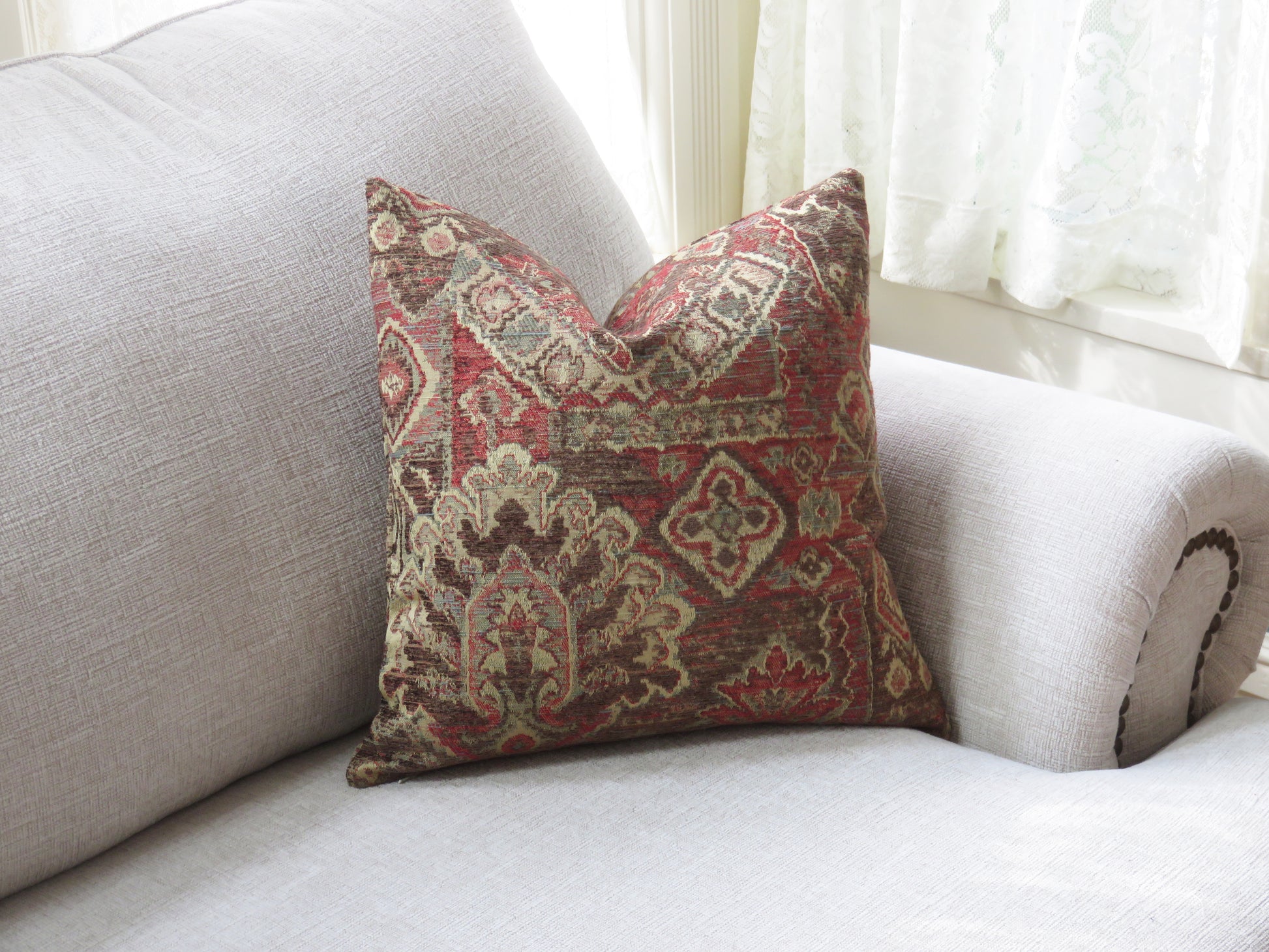 17 x 17" pillow cover meant to be used with an 18" insert, not included. Created from a heavy chenille upholstery fabric with a Southwest / Kilim motif in gold, brown, rust, and blue tones. Same fabric on the back, different part of the motif, invisible zipper closure in the bottom seam. Multiples of this pillow, if still available, feature different sections of this elegant fabric. Please click on the pictures to see the details and colors of this beautiful fabric!