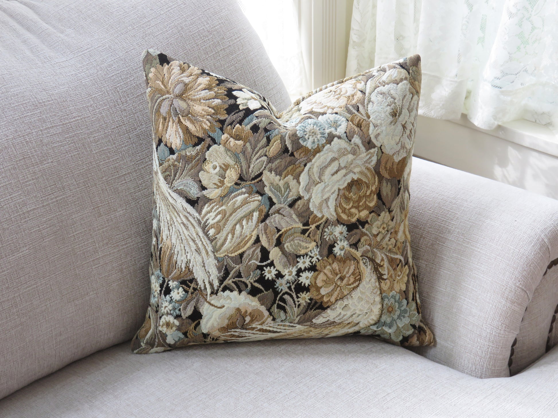 17 x 17" pillow cover is meant to be used with an 18" insert (not included). Created from a beautifully detailed, tapestry upholstery fabric with a textured floral and bird motif. Many tones of gold, cream, aqua blue, and black. Backed the same tapestry fabric. Each pillow cover has a unique pattern placement. Insert not included.