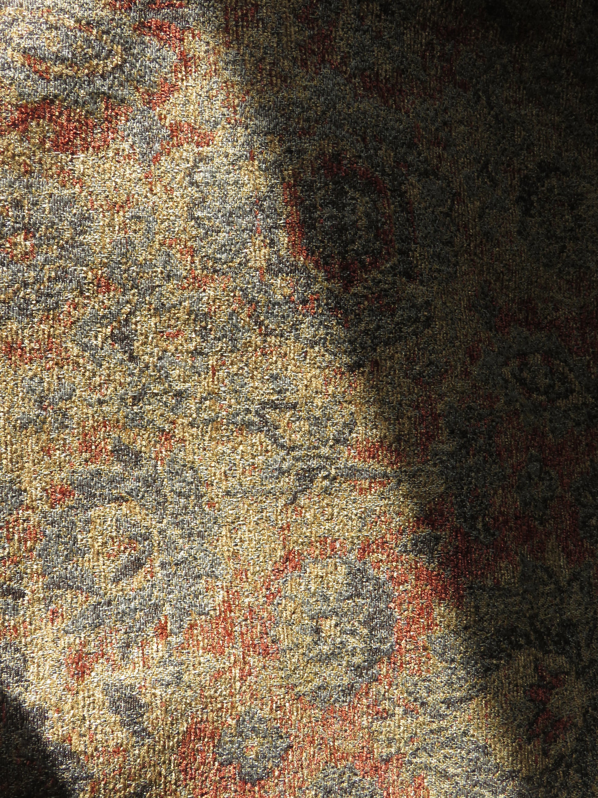 17 x 17" pillow cover meant to be used with an 18" insert, not included. Created from a heavy and soft chenille upholstery fabric with a distressed Kilim carpet / Southwest motif in shades of grey, rust, and gold,. Same fabric on the back, different part of the motif, invisible zipper closure in the bottom seam. Multiples of this pillow, if still available, feature different sections of this elegant fabric. Please click on the pictures to see the details and colors of this beautiful fabric!