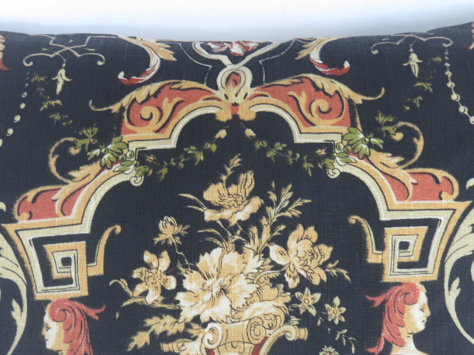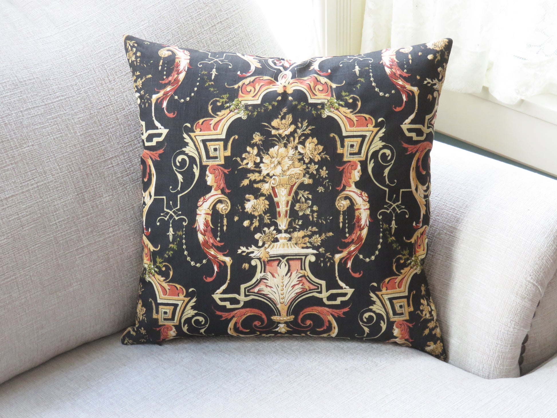 17 x 17" pillow cover meant to be used with an 18" insert, not included. Created from a 100% linen print. Stunning motif of urns, flourishes, florals, and women figureheads - this would be beautiful in a neoclassic, Art Decor, or Art Nouveau decor. Many shades of orange, cream, green, rust, gold, and black. Same fabric , on the back, different part of the motif, invisible zipper closure in the bottom seam. ONLY TWO AVAILABLE. Insert not included. *Please click on the pictures to see the details and colors of this beautiful fabric!
